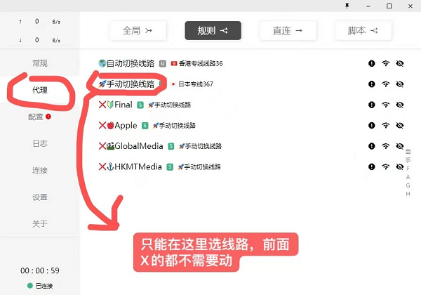 全局模式需要在GLOBAL【节点选项】:点击选择线路。