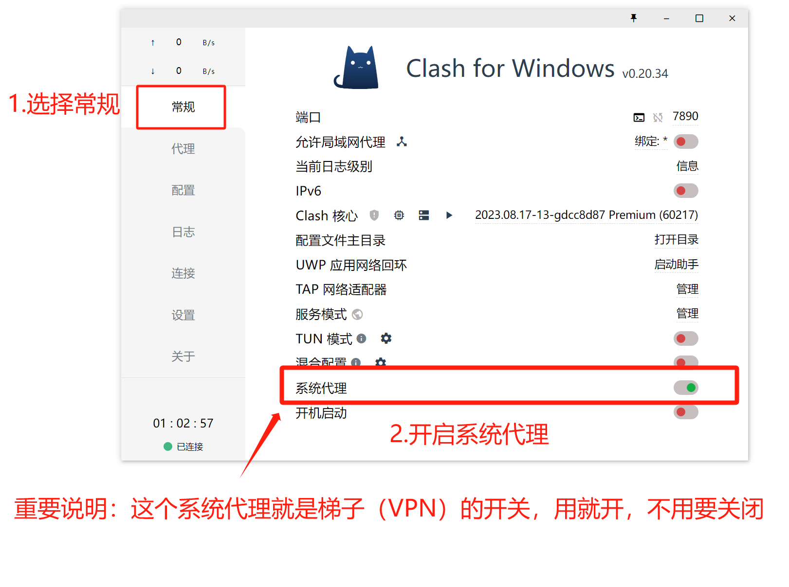 ⚠️如果打开了系统代理还是上不了网,请继续打开系统代理上面的【混合配置】【TUN模式】,在试试,不行在重启电脑。